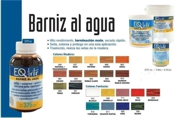 El Barniz al Agua Eq Arte x375ml es un producto de alta calidad, especialmente formulado para aplicar sobre superficies como madera, mimbre, bizcocho cerámico, caña, cemento, entre otros. Este barniz ofrece un acabado brillante, mate o satinado, según la preferencia del usuario. Su fórmula a base de agua garantiza una aplicación fácil, rápida y sin olores fuertes, lo que lo convierte en una opción ideal para proyectos artísticos y decorativos.