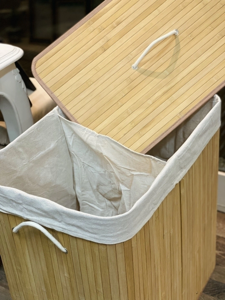 Cesto elegante y funcional diseñado para optimizar el espacio en tu hogar. Su diseño con doble compartimento interior facilita la separación de prendas o artículos.