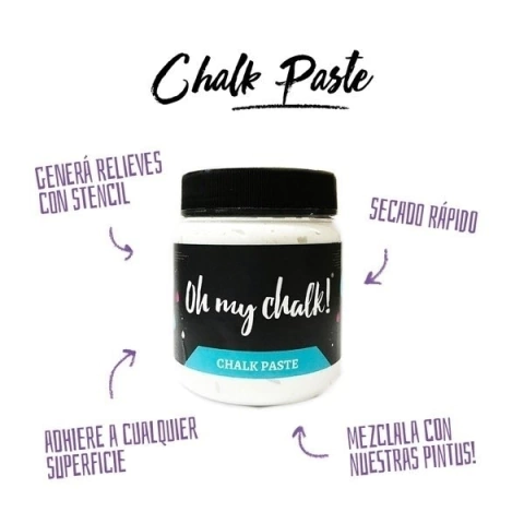 Chalk Paste Oh My Chalk es una pasta ideal para generar relieves con stencil, perfecta para aportar textura y dimensión a tus proyectos de decoración. Su fórmula versátil permite que se adhiera a cualquier superficie, y se puede mezclar con las pinturas Oh My Chalk para darle color, manteniendo la saturación de los colores al secar. De secado rápido, esta pasta también puede utilizarse como endudio o pegamento, lo que la convierte en una opción flexible para múltiples aplicaciones.