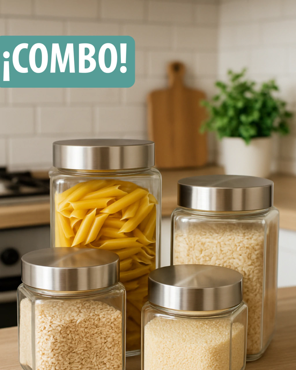 Este combo incluye 4 frascos cuadrados de vidrio con tapa de acero inoxidable en diferentes tamaños: 800 ml, 1200 ml, 1700 ml y 2100 ml. Son ideales para organizar tu cocina con onda y mantener tus alimentos frescos. Su diseño moderno y minimalista se adapta a cualquier estilo. Perfectos para almacenar arroz, fideos, cereales, legumbres, galletitas o lo que necesites.